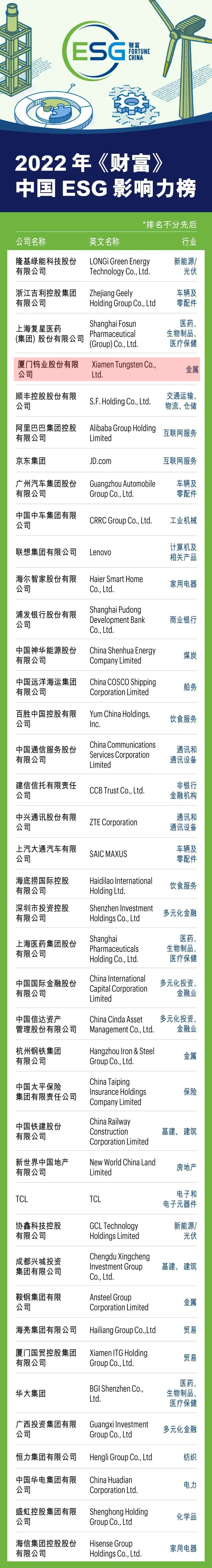 近日,《財富》發(fā)布首份中國ESG影響力榜,有40家在改善環(huán)境、保護員工、支持社區(qū)上做出了卓越努力的中國企業(yè)上榜,廈門鎢業(yè)成功入選。